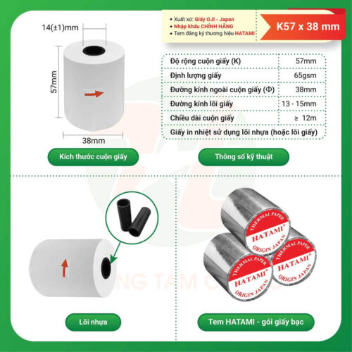 Giấy in nhiệt K57x38 mm dùng cho in hóa đơn thanh toán trong các máy cà thẻ ngân hàng (Máy POS, máy quẹt thẻ), máy in di động, máy in bill…